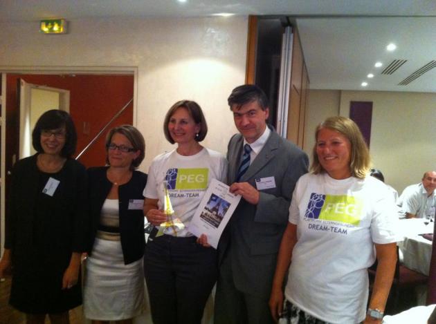 Im Bild die glücklichen Gewinner in PEkG-T-Shirts: Ingrid Wallner, MBA, Mitbegründerin und Koordinatorin (Bild Mitte) und Dr. Brigitte Haider, Vertreterin des Wiener Elternverbands und Mitglied der Arbeitsgruppe (rechts), dazwischen Mag. Johannes Theiner (Präsident der EPA) und links die Präsidentinnen der französischen Elternverbände APEL und PEEP.